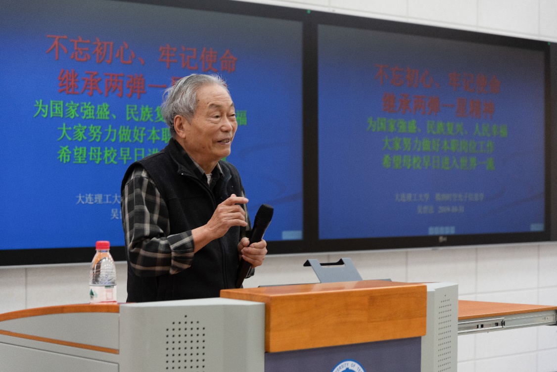 在吴世法教授的讲述中,“绝密调令”“进入信箱”“三个字”“官厅水库旁”四个关键词,还原了我国第一颗原子弹研制工作启动之时的实景。在火车车厢接缝处以背包为垫,彻夜研究高速扫描相机轨迹法;在深夜饿过劲后突发灵感,不眠不休10小时绘制三镜转向机构图纸;在邓稼先院长的“死命令”下坚持原则,终于实证测量中的γ干扰;不慎让“化学酱油”染花了陈能宽主任的人造羊毛外套,得到陈主任的宽容原谅:这四段让吴教授印象最深刻的真实故事,再次让研制工程的艰苦条件和人物形象生动地浮现在师生眼前。吴教授总结说,“实事求是,是科研工作者最重要的品质,也是研究工作的铁律,更是中国共产党人永远应该遵循的思想方法。”