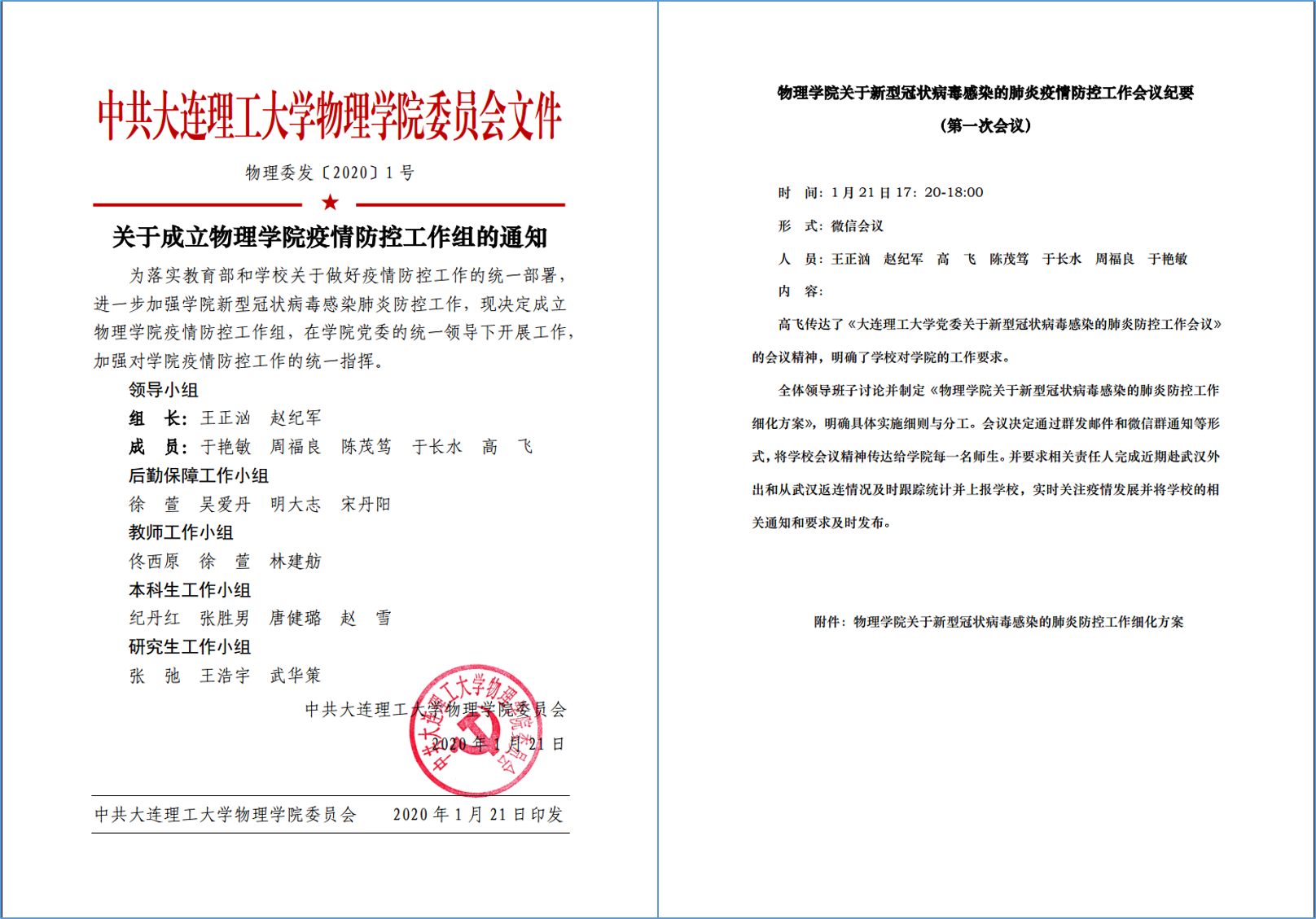 学校疫情防控工作伊始,星空(中国)迅速成立了以党委书记王正汹、院长赵纪军为双组长的学院疫情防控工作组,明确该项工作由学院党委负责,领导班子全体成员参与并承担不同分工。学院党委参考 “一岗双责”要求,确定了领导班子各成员在疫情防控工作中的责任所在,相应按照党、政、研、本的划分成立了4个工作小组,将疫情防控工作的上级部署与院内事务进行了清晰的分配。