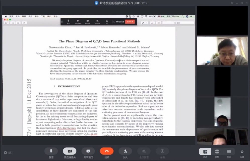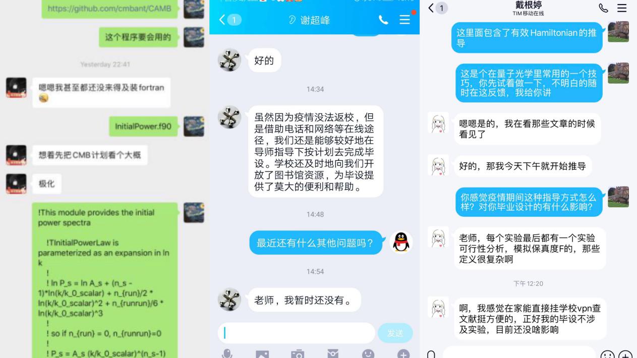 何浩同学说:虽然在大工的学习生活已培养出我们积极自主学习的能力,但由于没有返校,从寒假放松的生活节奏中走出来仍然存在困难,在钉钉上开展的课程,利用网络打破了教室的界限,老师为我们仔细讲解了本硕打通的量子场论的知识内容,传道授业,排疑解惑,同时也为我恢复良好的学习节奏,制定学习计划提供了动力。