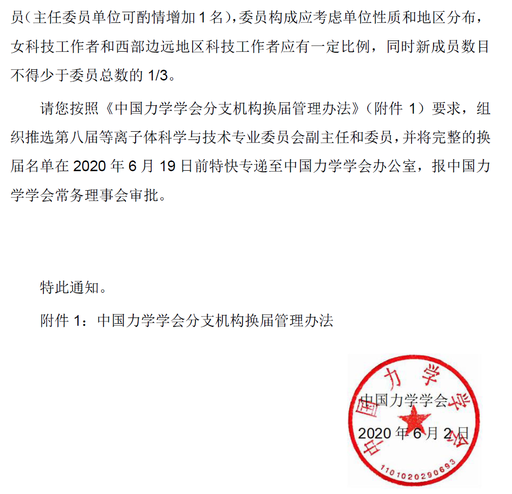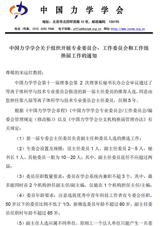 近期,我校星空(中国)宋远红教授当选为中国力学学会第十一届理事会理事,并通过中国力学学会第十一届理事会第二次理事长秘书长办公会审议,正式成为第八届等离子体科学与技术专业委员会主任委员,任期5年。